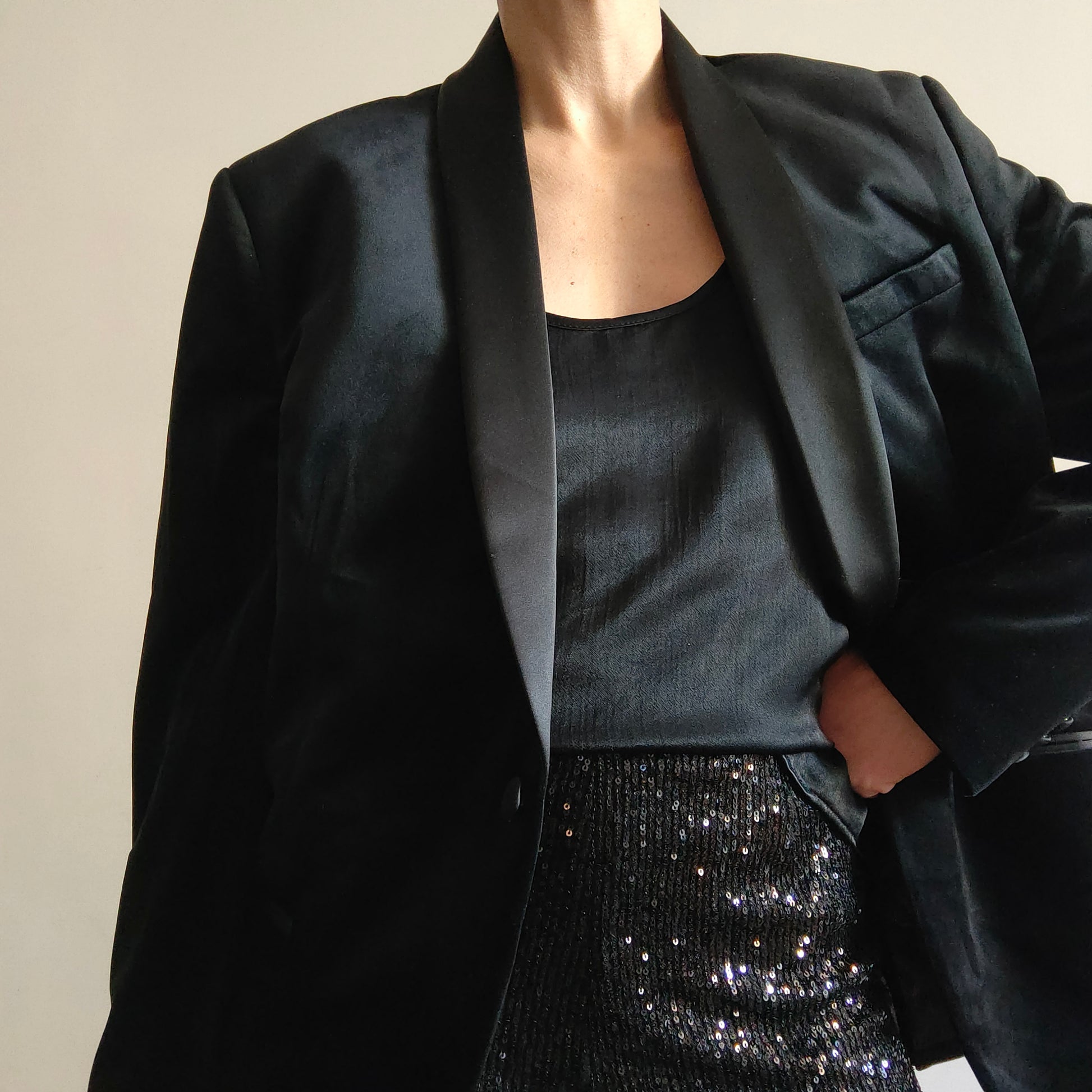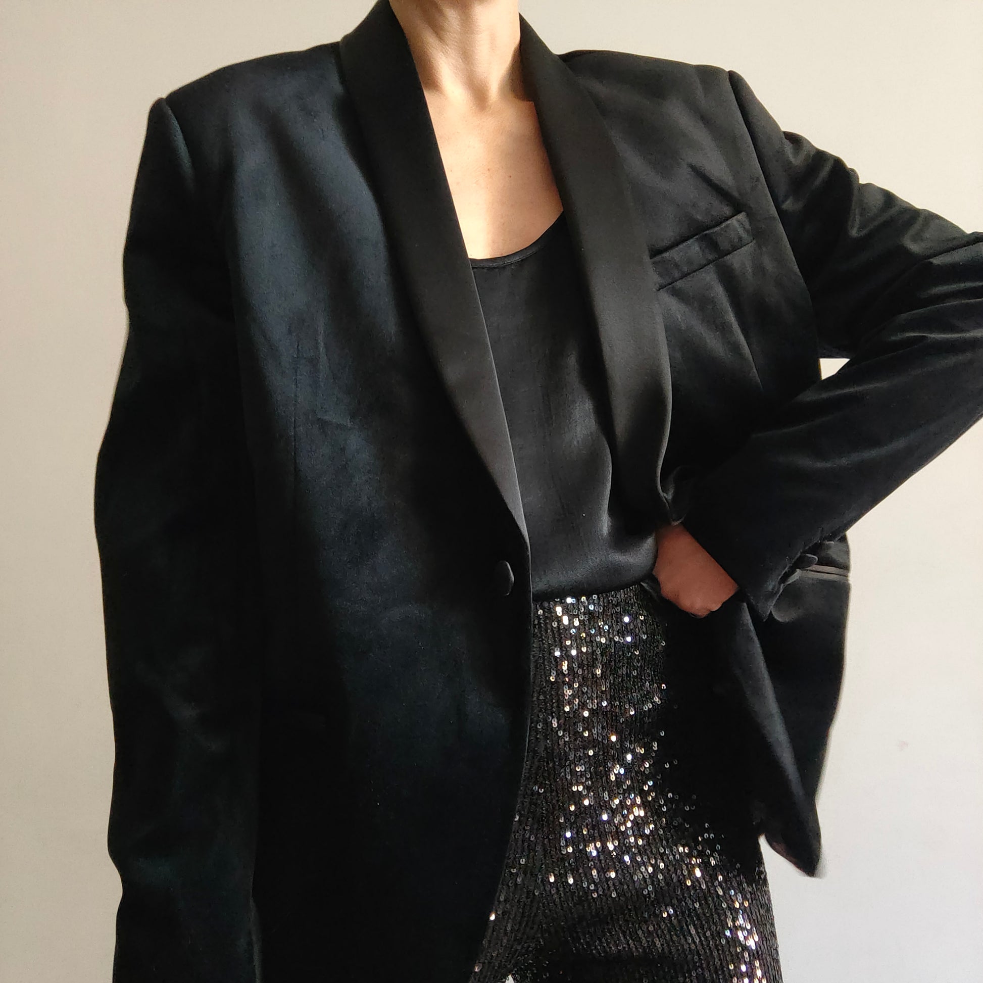 Blazer oversize senza tempo, modello smoking con revers in raso perfetto per ogni occasione.