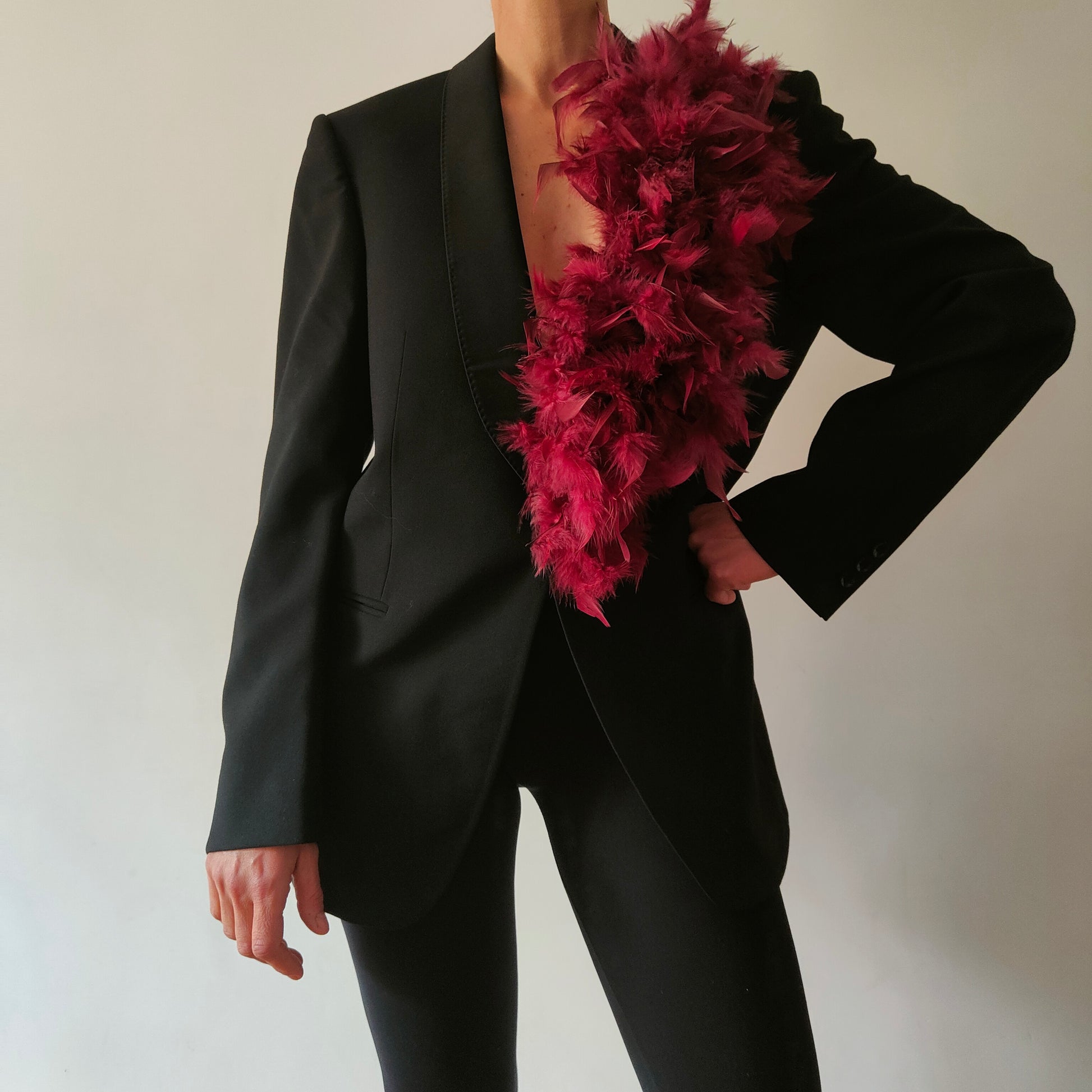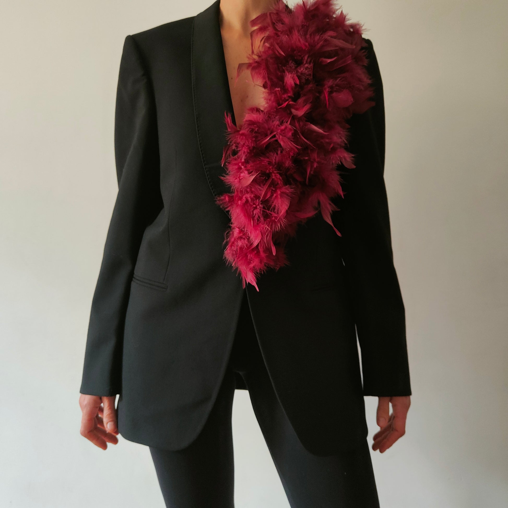 Blazer maschile monopetto con reservers in raso arricchito a mano con leggere piume naturali, selezionato per essere indossato da una donna, con vestibilità oversize e linee decise.