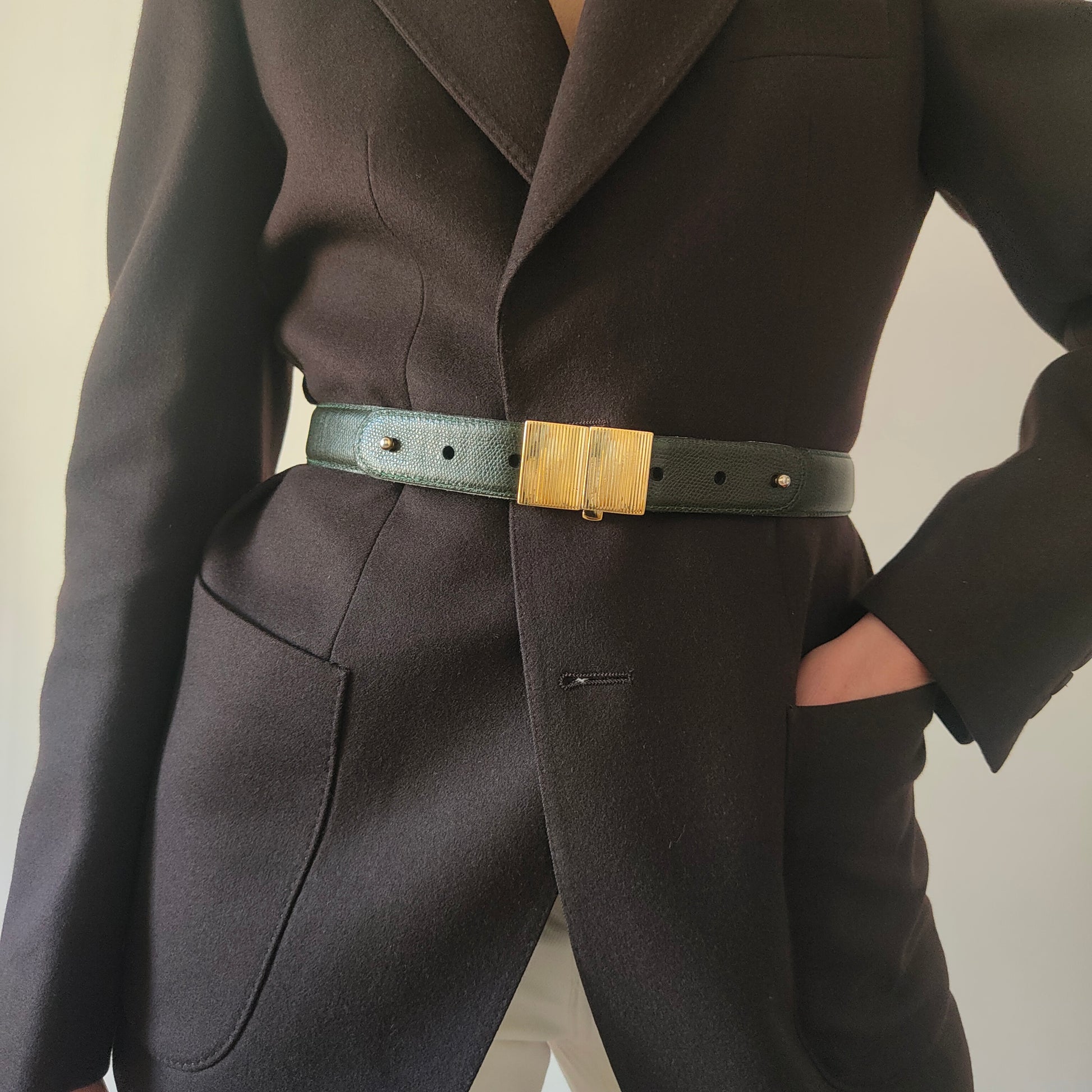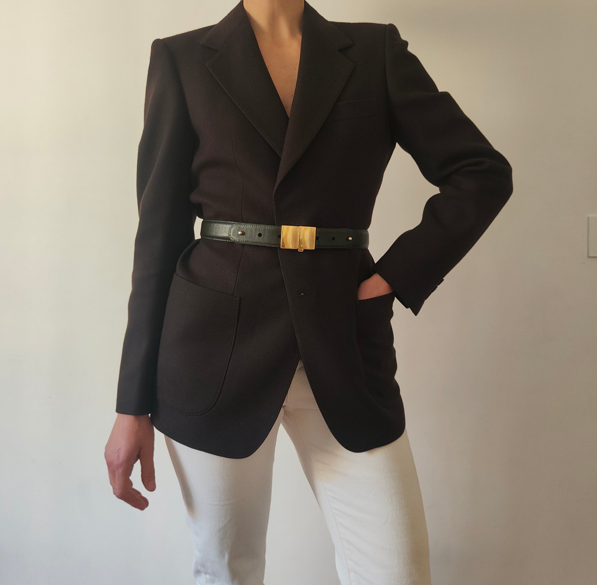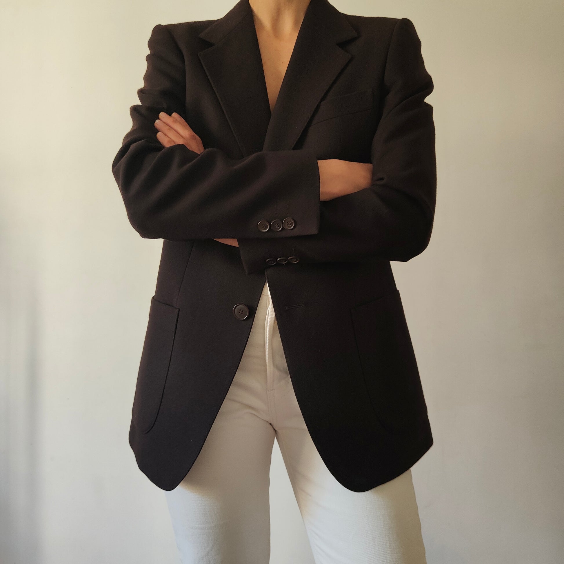 Blazer maschile selezionato per essere indossato da una donna, con vestibilità oversize e linee decise.