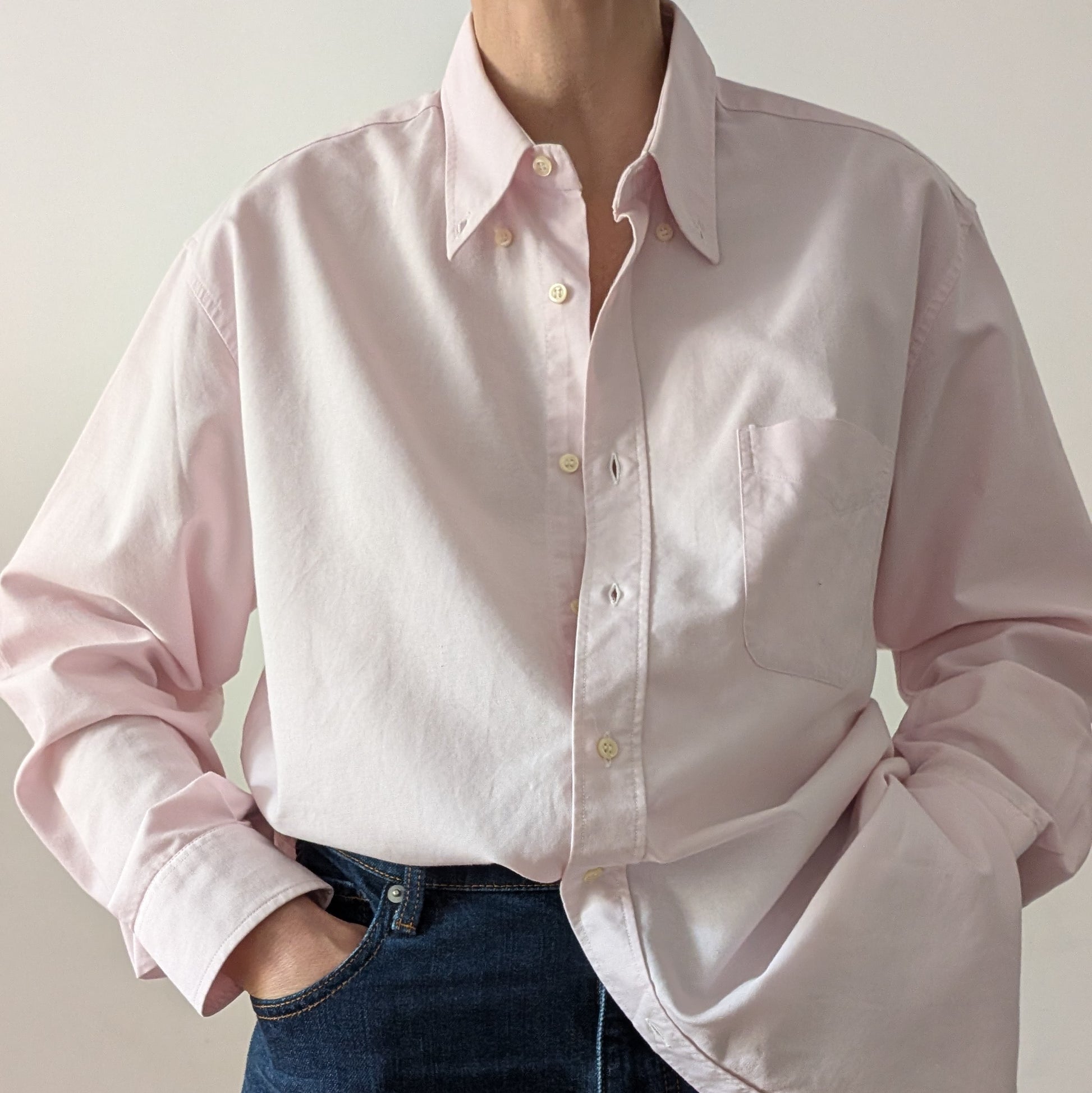 Camicia maschile Burberrys selezionata per essere indossata da una donna, con vestibilità oversize e un’estetica essenziale.