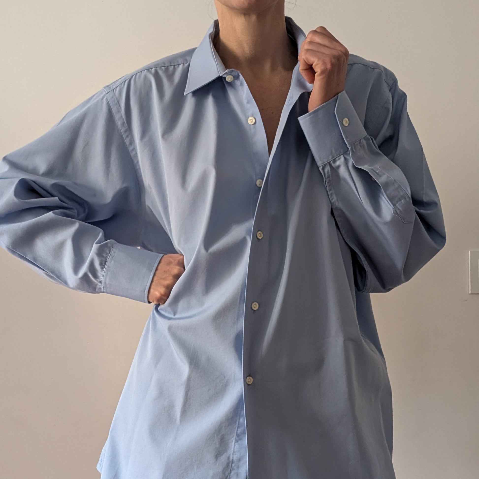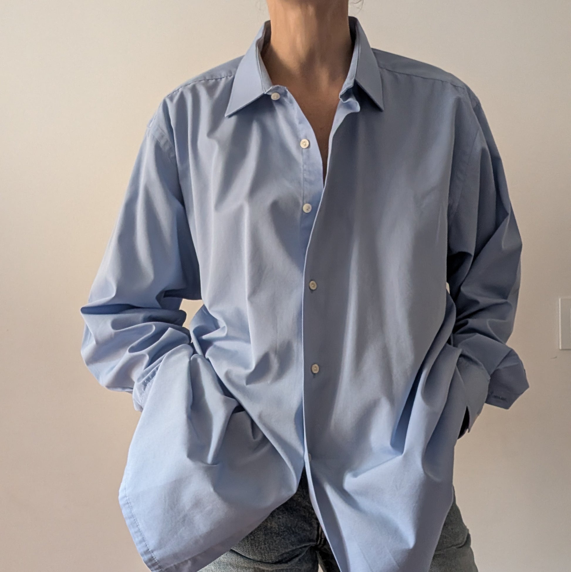 Camicia maschile Pierre Balmain selezionata per essere indossata da una donna, con vestibilità oversize e un’estetica essenziale.