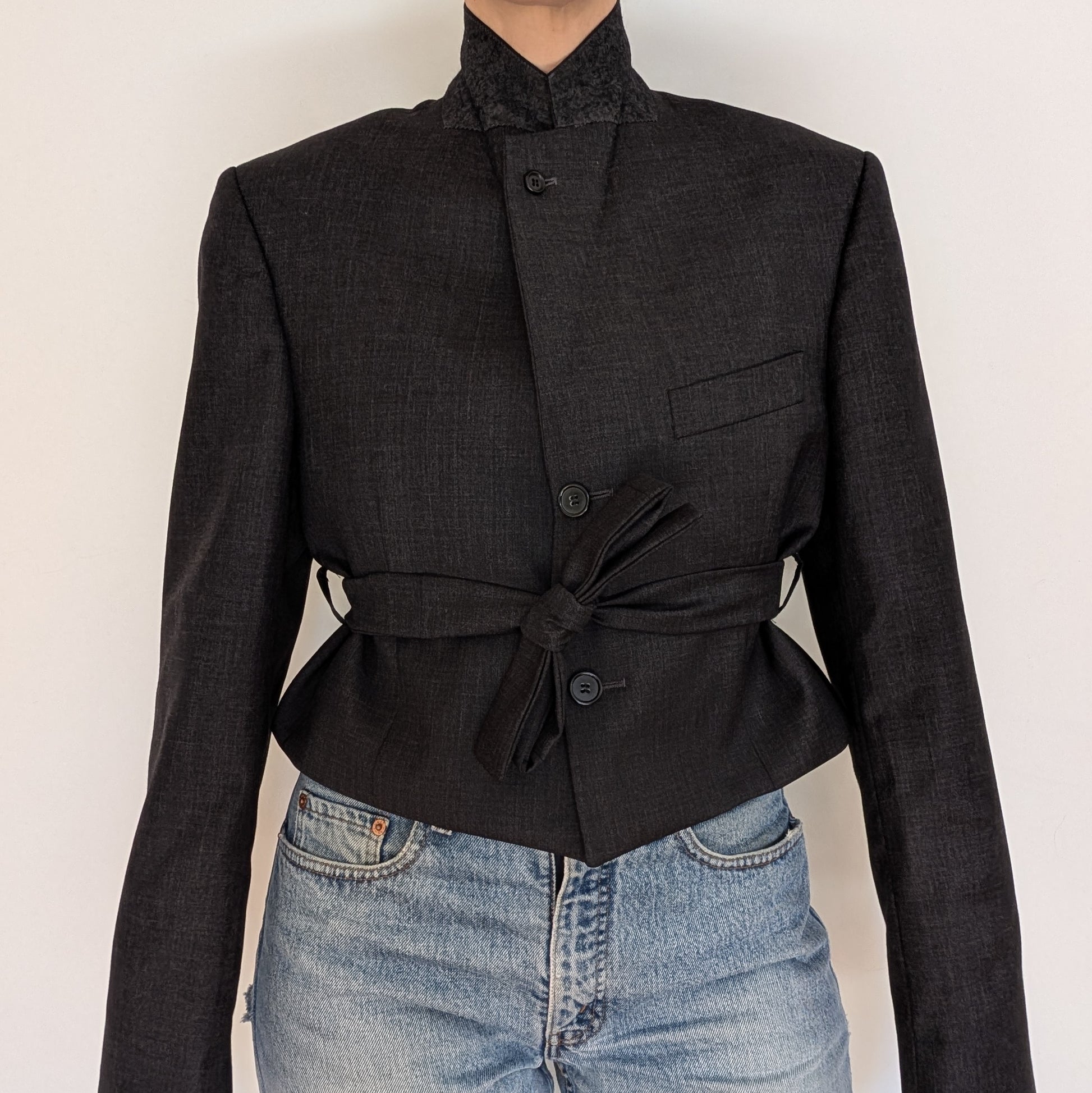 Blazer maschile vintage selezionato per essere indossato da una donna, reinterpretato in versione cropped, con vestibilità oversize e linee decise.