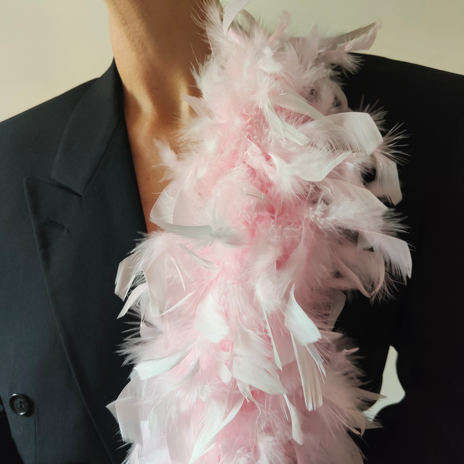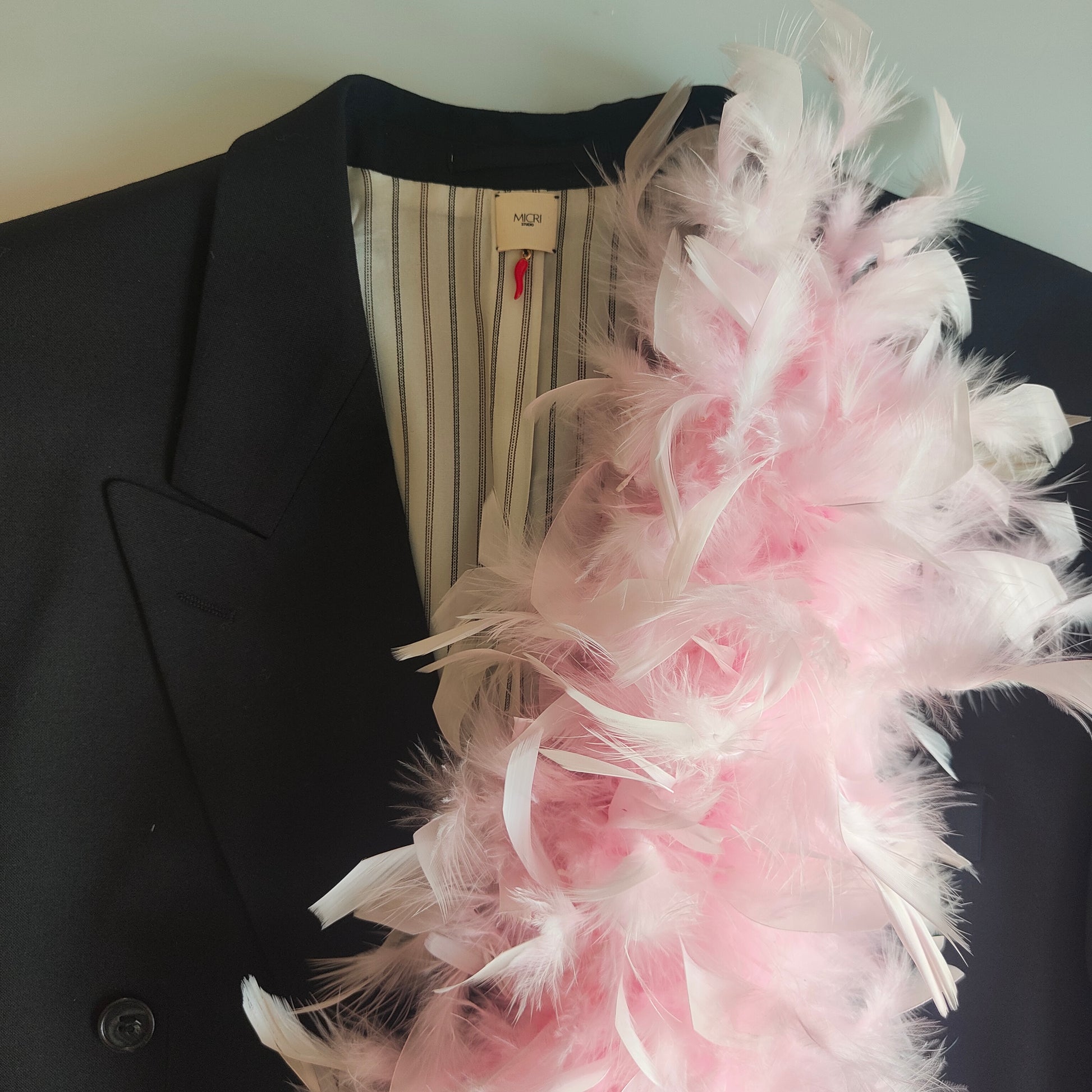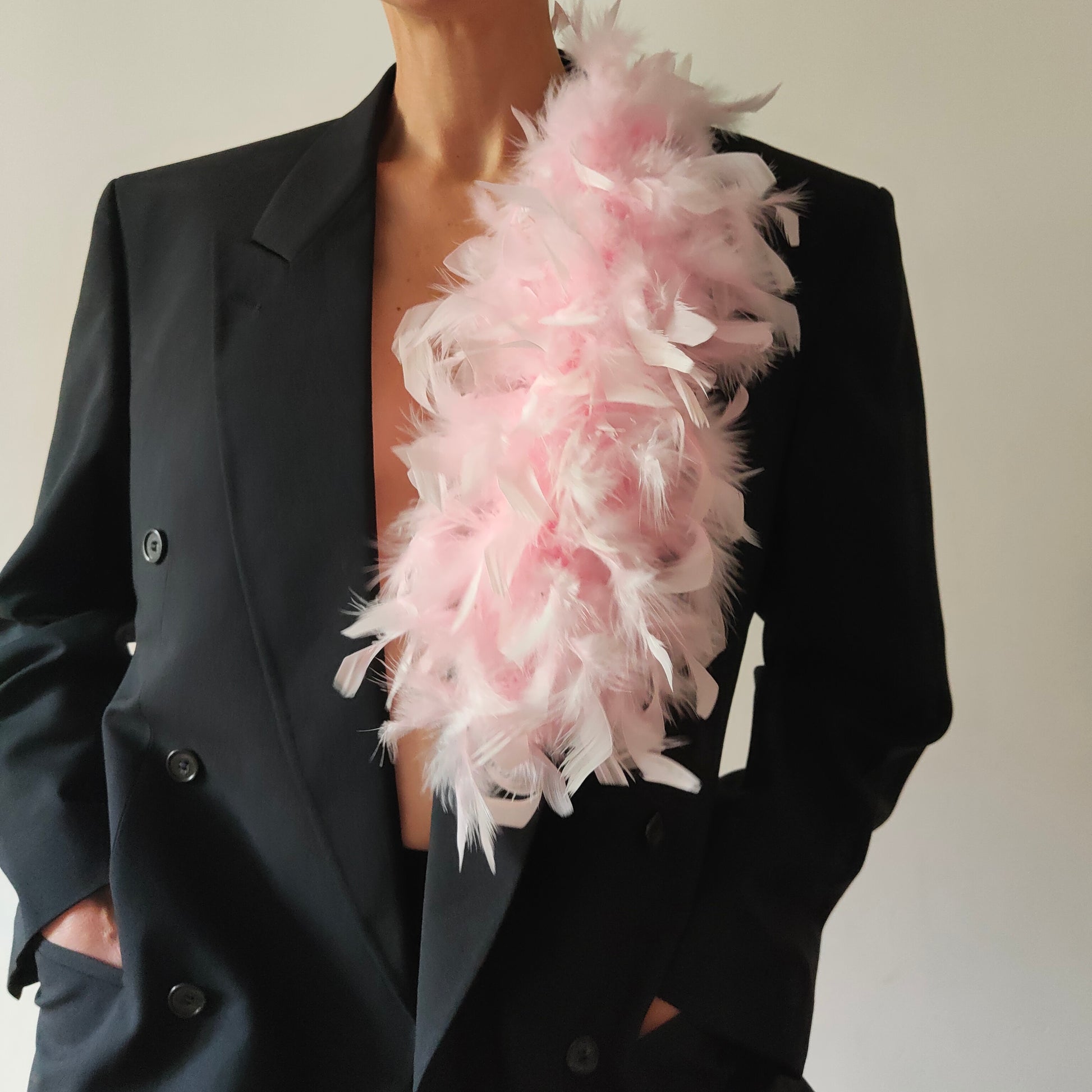 Blazer maschile doppiopetto arricchito a mano con leggere piume di struzzo, selezionato per essere indossato da una donna, con vestibilità oversize e linee decise.